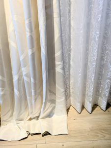 【リターン仕様】カーテンレールよりも片側10㎝程度カーテンを大きく制作して、カーテンの端部をレース側のカーテンレールに引っ掛ける仕様です。横からの隙間風を防ぎます。